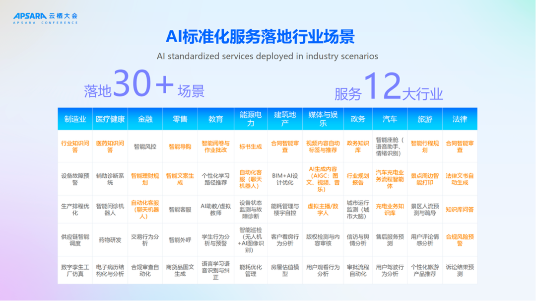因为阿里云的标准化解决方案已经覆盖了相当广的范围。从传统的地产、制造、零售,到新兴的媒体娱乐、智慧政务,再到民生相关的医疗、教育——12个行业都有成熟方案。场景更是丰富:除了会上分享的知识库、合同审核、AI阅卷,还有智能导购、法规智能审查、智能客服等30多个高频应用。