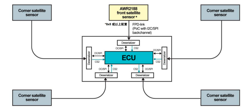 围绕AWR2188,TI采用了“卫星雷达架构(Satellite Architecture)”的设计思路。在这一架构中,分布在车身各处的雷达节点不再承担复杂的点云生成与目标级处理任务,而是回归为更纯粹的感知前端。