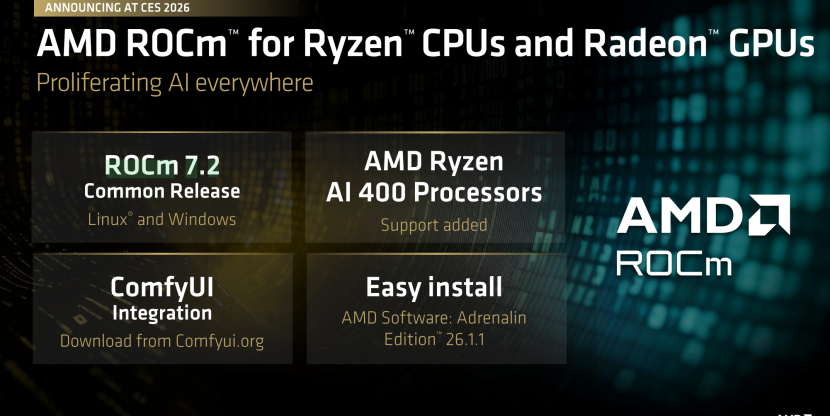 本次CES 2026上,AMD推出ROCm 7.2,这是其软件生态建设中的关键一步,目标直指广泛的开发者使用场景。