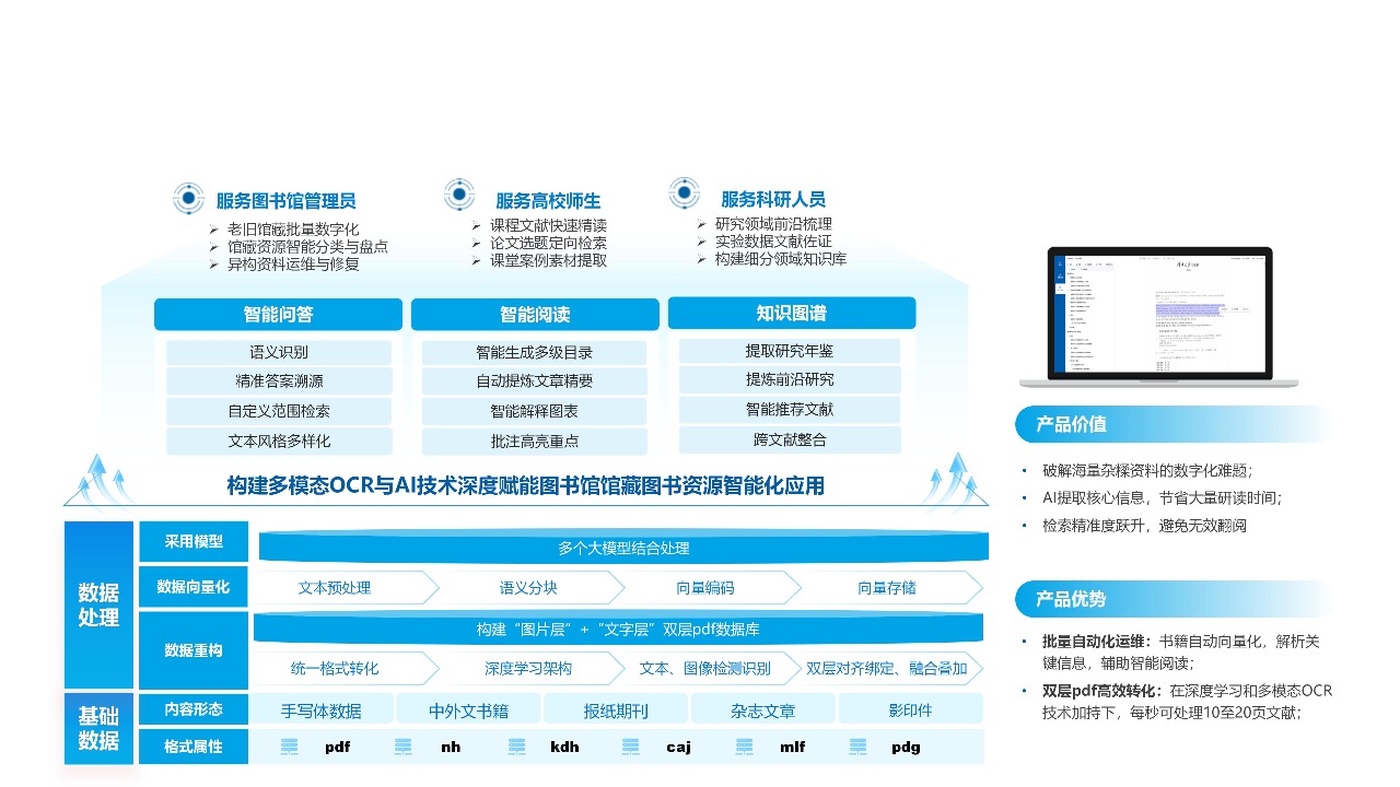 一、针对海量异构图书资料,凭借多模态OCR精准识别能力,高效生成“图像层+文本层”双层PDF,完整保留原始版式的同时实现文本可检索、可编辑,破解杂糅资料数字化难题;