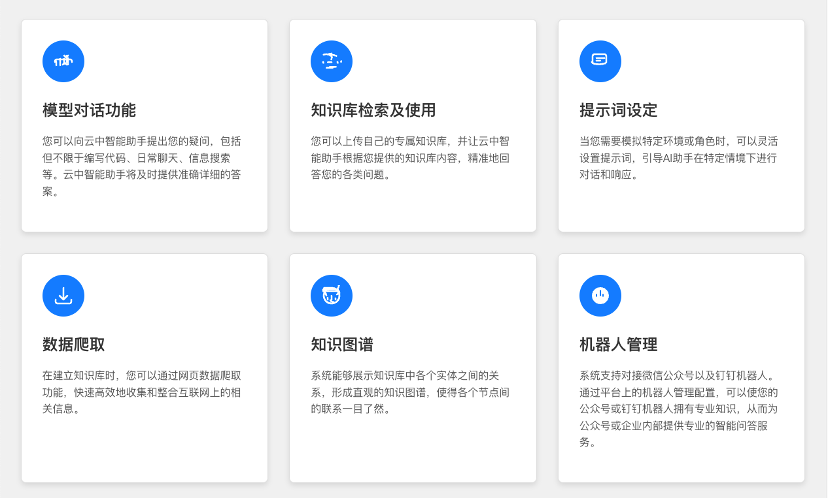 "云中智能助手是一个基于自然语言大模型的AI助手,旨在成为一个强大的交互式平台。它能够利用企业或个人日益增长的大数据,您提供一系列的自动化工具和应用。
